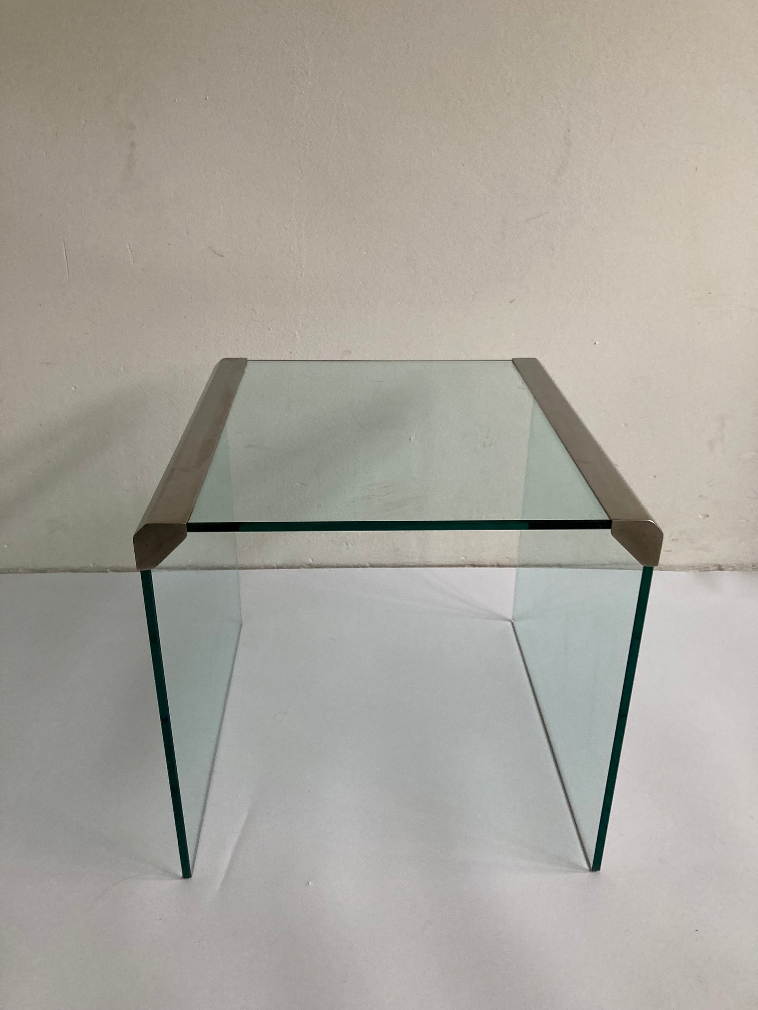 Bijzettafel (jaren 70) Galotti e Radice. Tafel is gemaakt van transparant glas met zilverkleurige stalen rand. Tafel is in uitstekende staat.