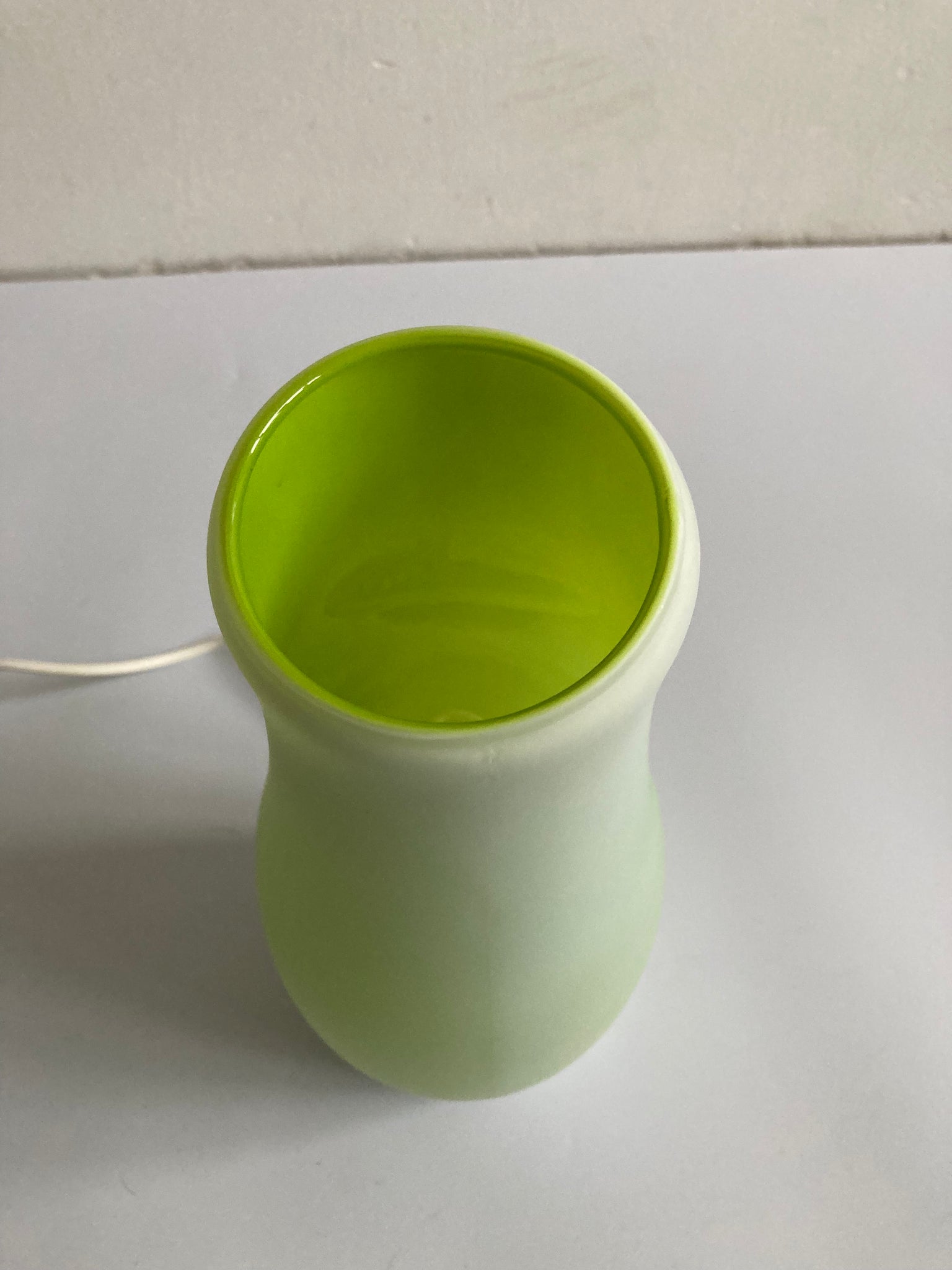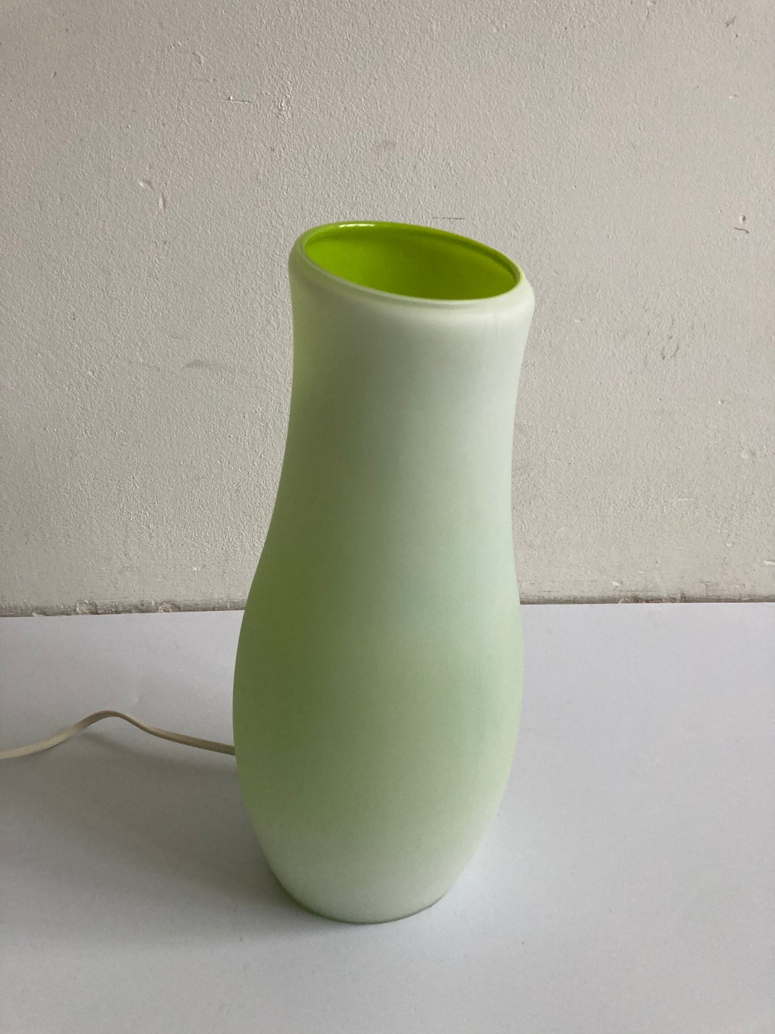 Glazen tafellamp (handmade) van Ikea uit de jaren 90. Wit glas met groene binnenkant.