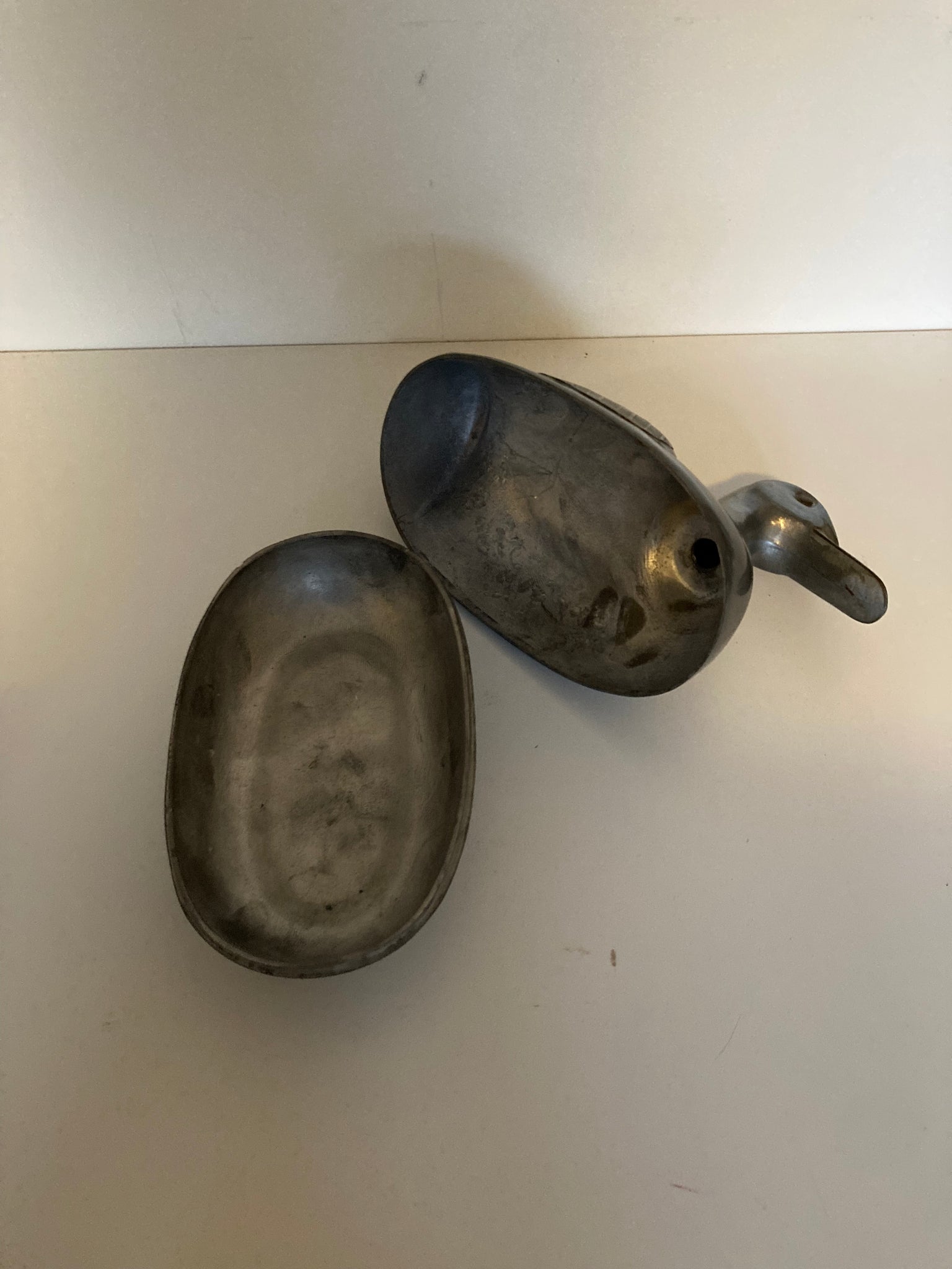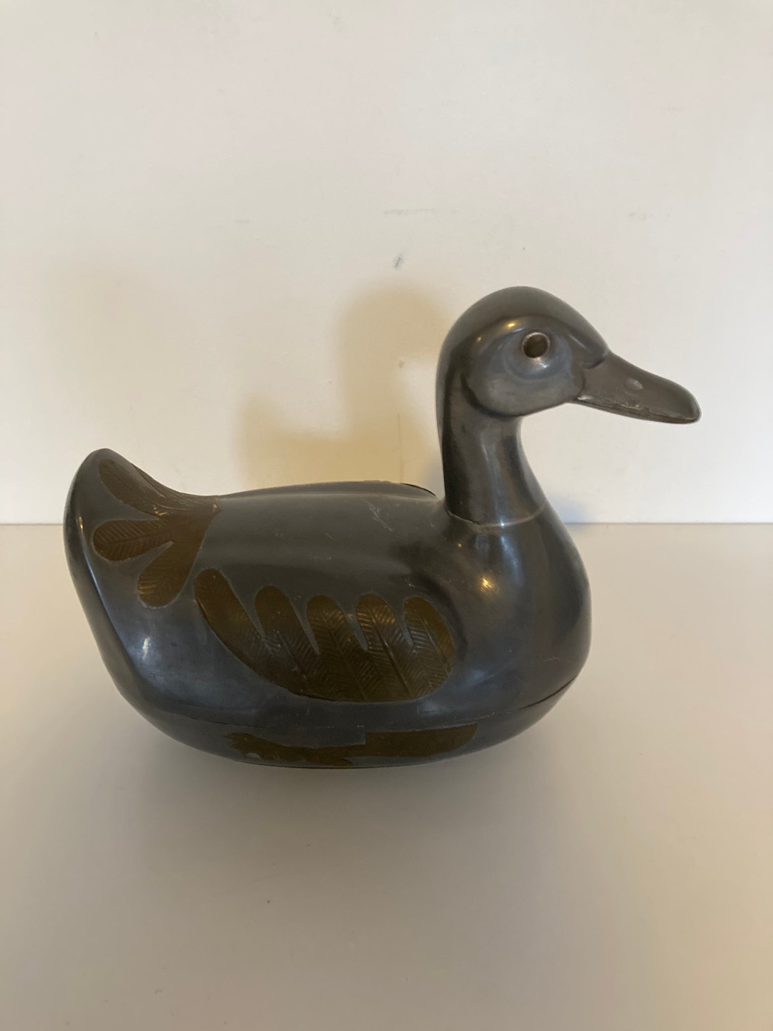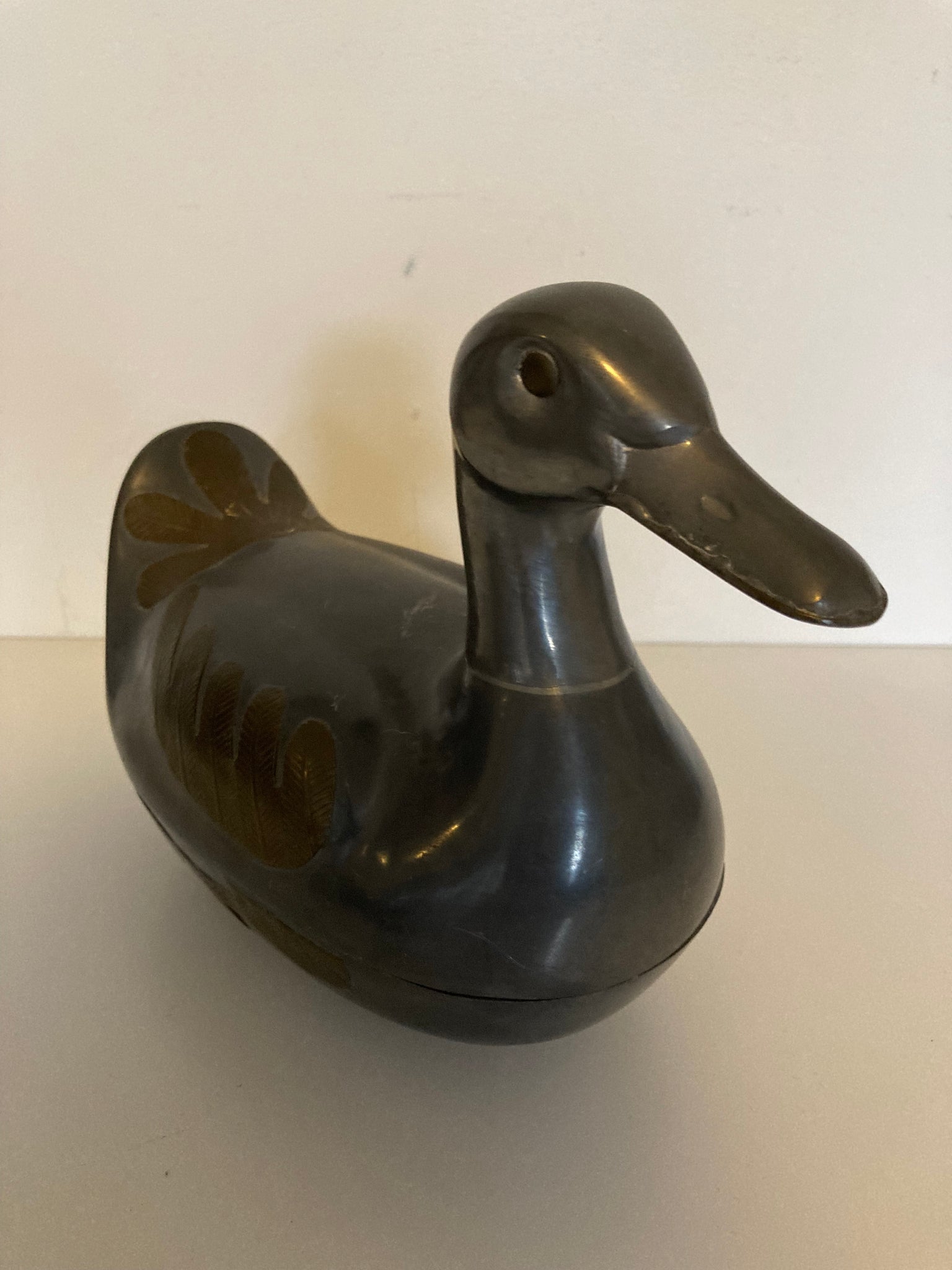 Vintage tinnen eend belegd met koper. De eend kan open en gebruikt worden als juwelen doos. Afkomstig uit Hong Kong.